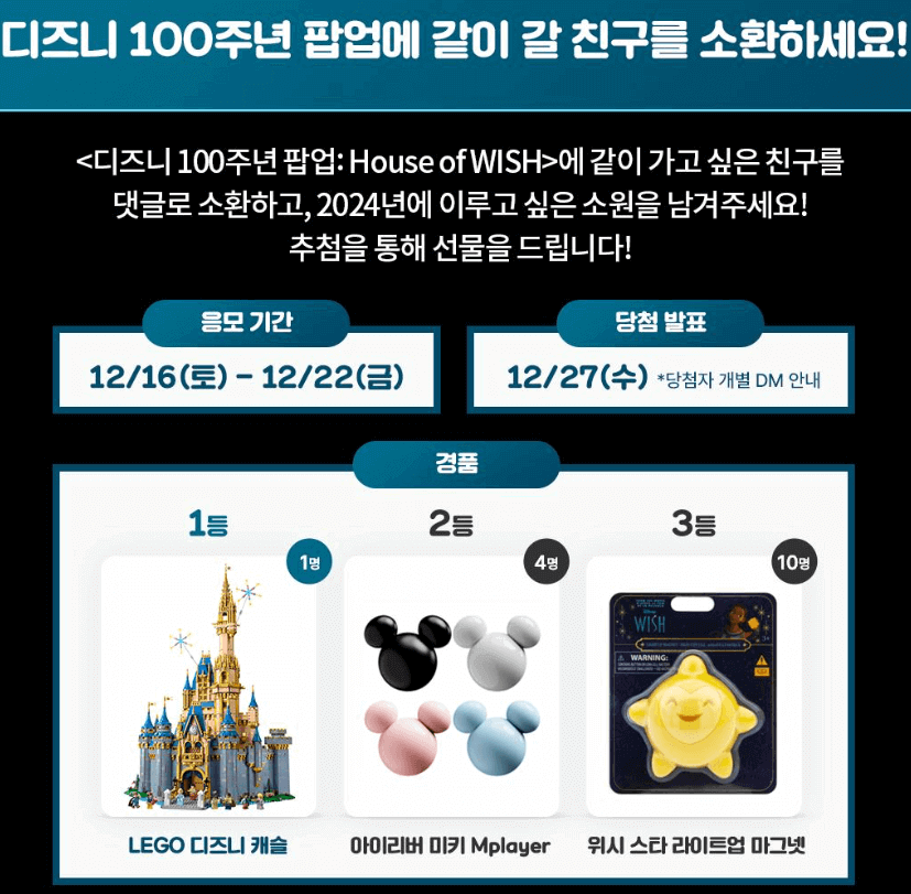 디즈니코리아 인스타그램에 소원댓글과 친구 소환글을 남기면 추첨을 통해 LEGO 디즈니 캐슬, 아이리버 미키 플레이어와 위시 스타 라이트업 마그넷을 선물로 받을 수 있다.