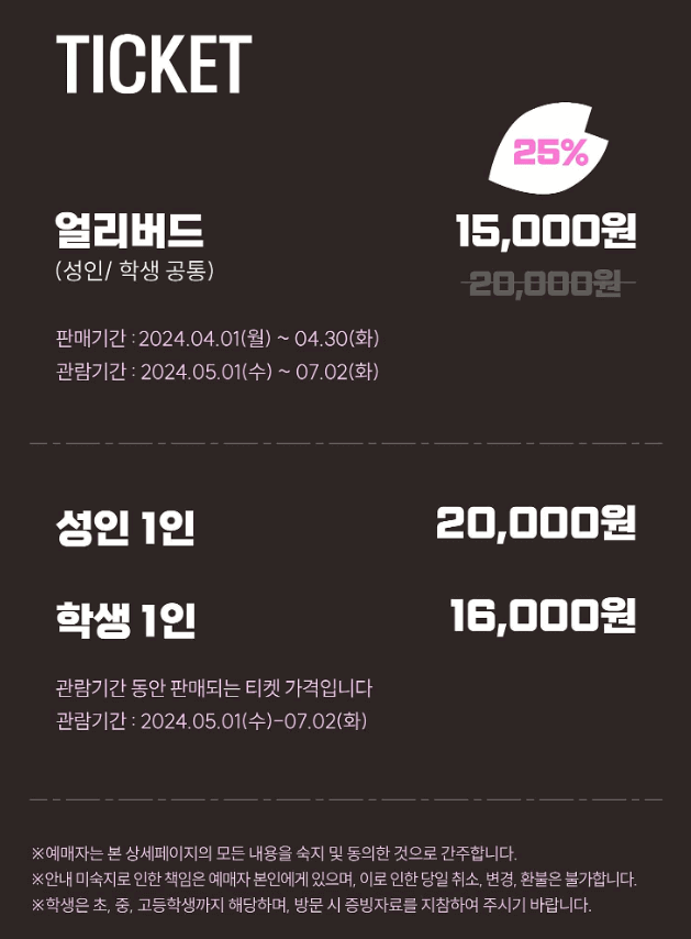 정상 가격: 성인 20,000원/ 학생(초·중·고) 16,000원