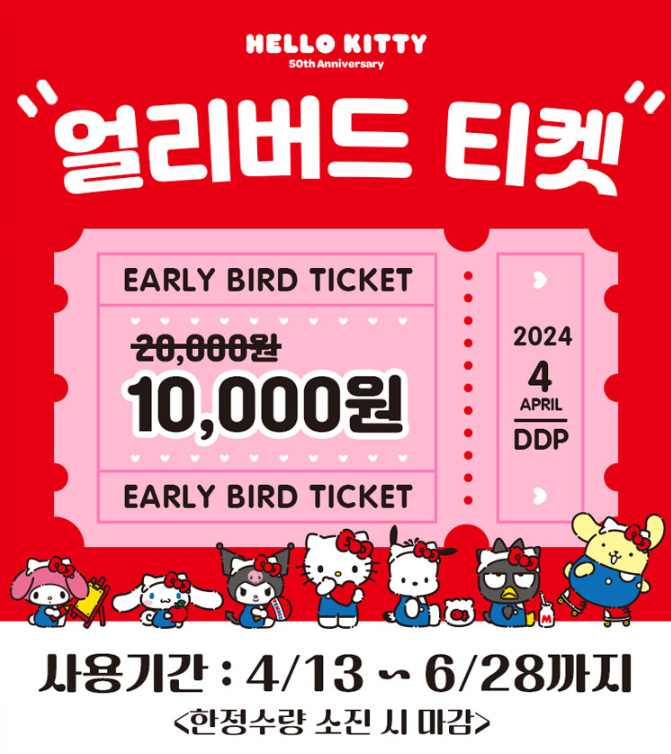 얼리버드 티켓을 구매하면, 헬로키티 50주년 포토카드를 선물로 받을 수 있으니 참고하시기 바란다.